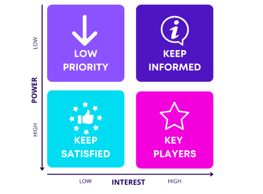 - High power, low interest: May require monitoring but less active management (e.g., media).